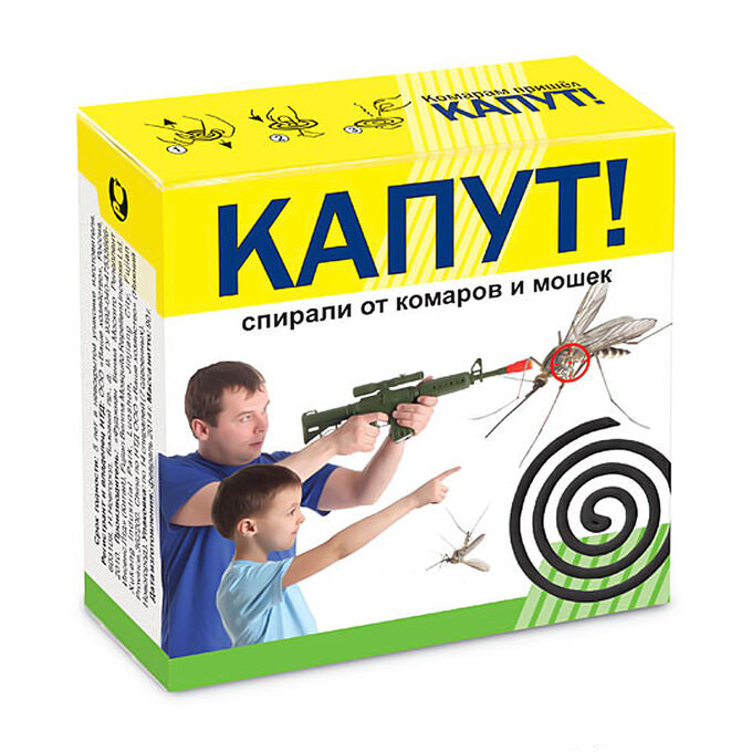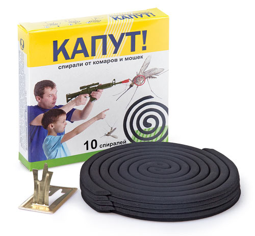 - Также рекомендуем спирали «Капут» от комаров для уничтожения комаров, мошек, мокрецов, москитов на открытом воздухе (сад, беседка, веранда) в присутствии людей, а также в закрытых помещениях.