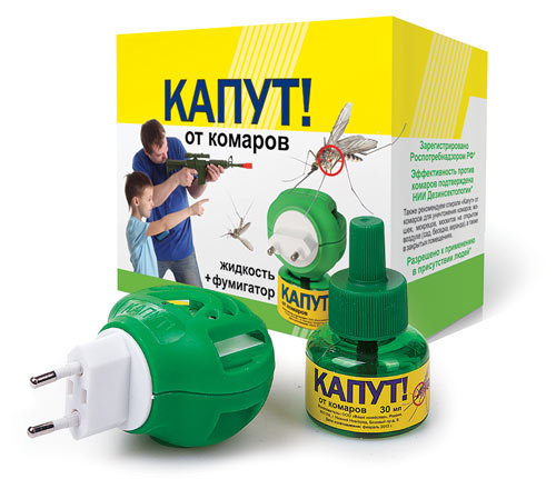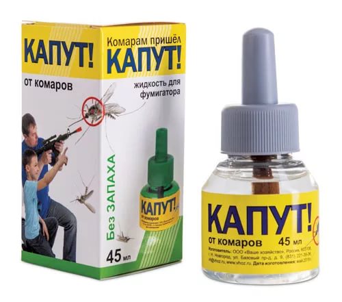 «Капут» — жидкость для фумигатора для уничтожения комаров в помещении.Полная гибель комаров в помещениях — через 20-30 мин в зависимости от площади.